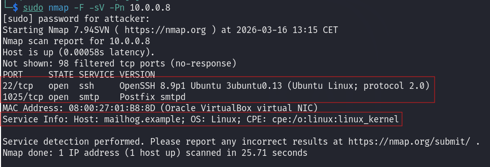Nmap scan of the mail server — MailHog ports 1025 (SMTP) and 8025 (web UI) exposed