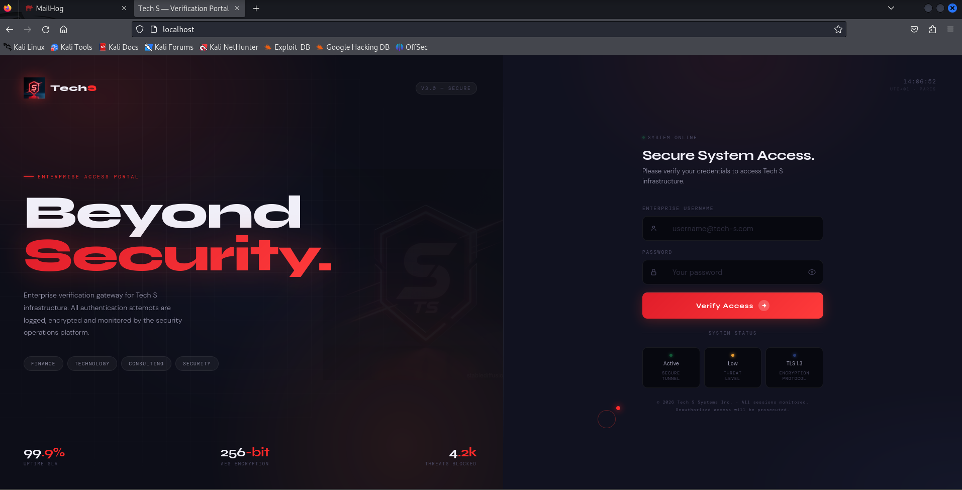Navigating to http://localhost in the Kali browser shows the live phishing page — a corporate login portal clone, styled to look legitimate.