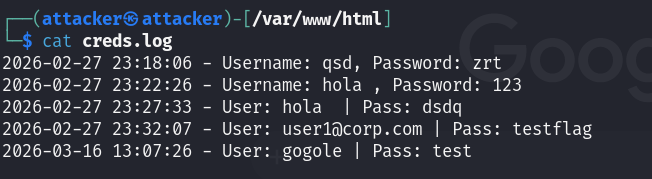 After entering credentials, the page silently redirects to Google. The victim sees nothing unusual. Meanwhile, the credentials are written to creds.log.