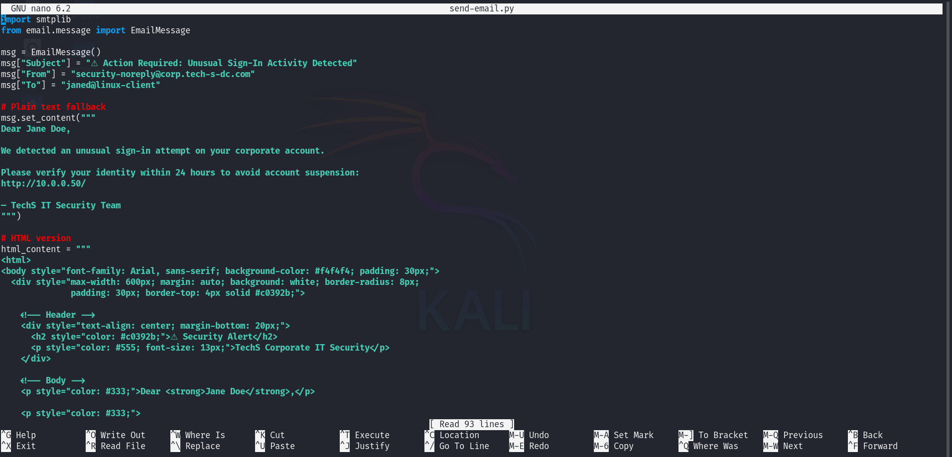 From the MailHog enumeration earlier, we know janed is a user on the network and her inbox is accessible at port 8025. We craft an HTML phishing email impersonating TechS’s IT security team, with the malicious link embedded in an anchor tag so the URL stays hidden in most email clients.