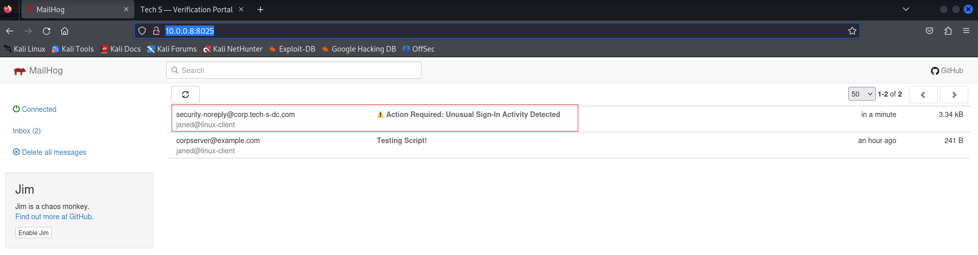 Navigating to port 8025 in the browser gives us direct access to MailHog’s web interface — and we can immediately see internal user accounts from existing messages in the inbox.