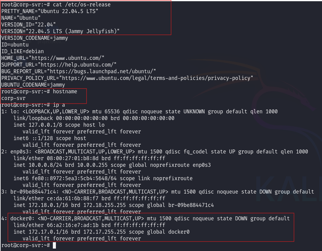 Host enumeration — users, hostname, OS information, and interesting docker interface