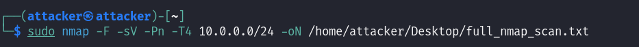 sudo nmap -F -sV -Pn -T4 10.0.0.0/24