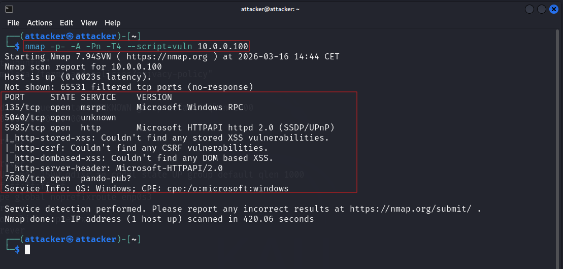 From inside our attacker machine we run a full /24 subnet scan to map every live host and exposed service on the network.