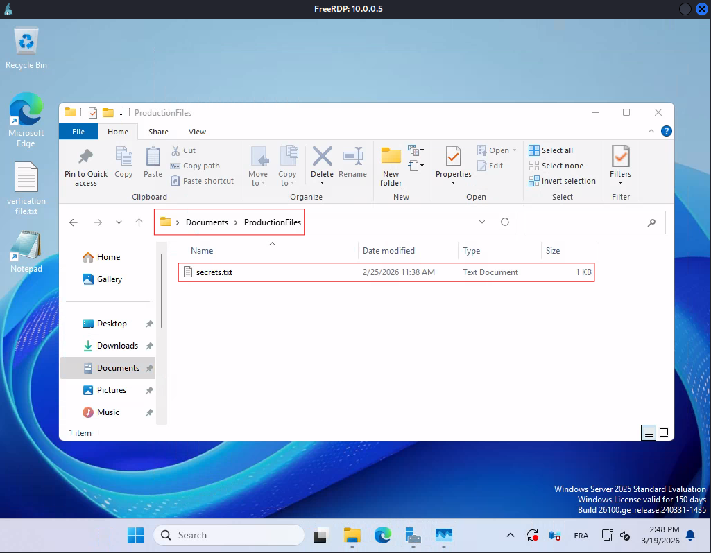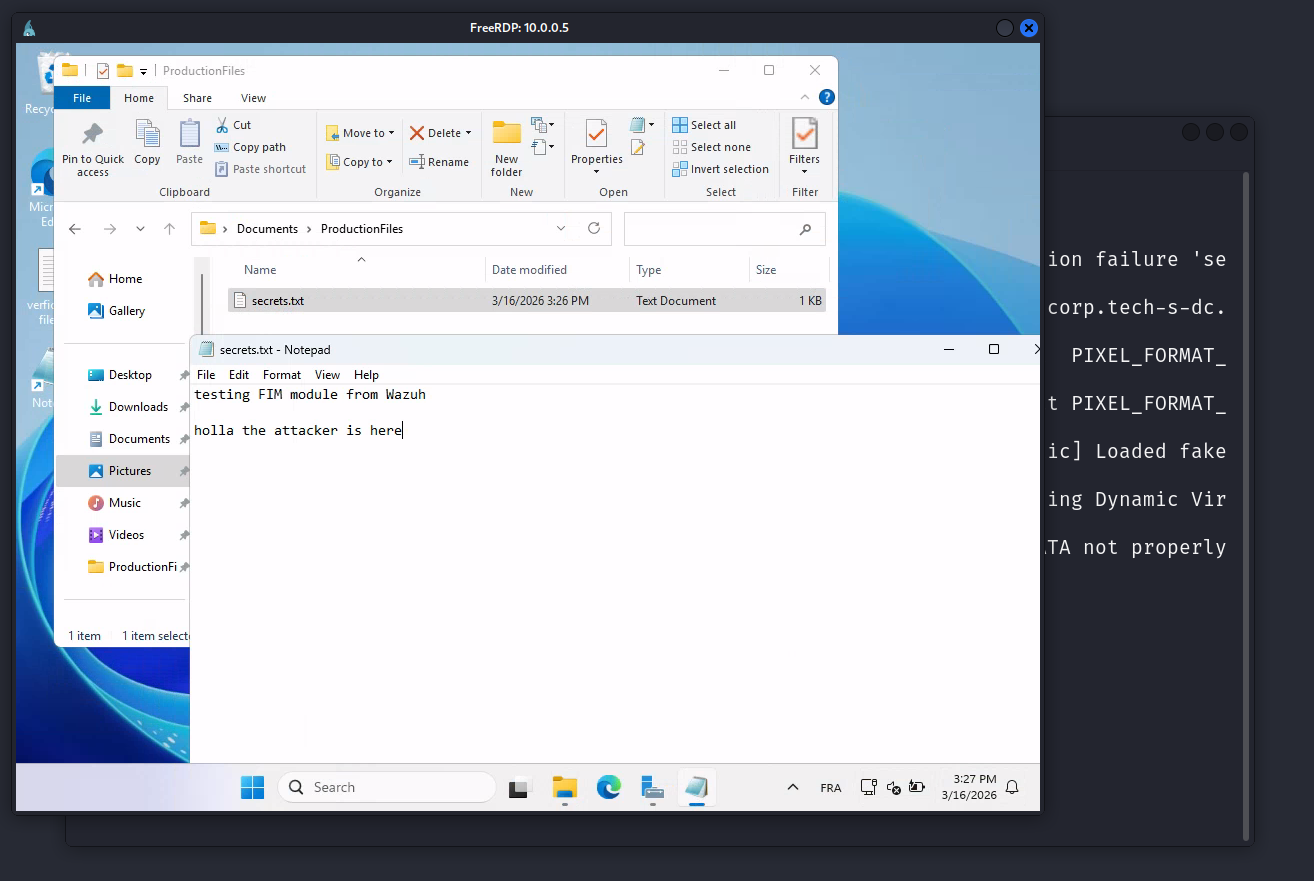 We modify the secrets file on the DC to replay the exfiltration scenario — the FIM alert fires almost immediately.