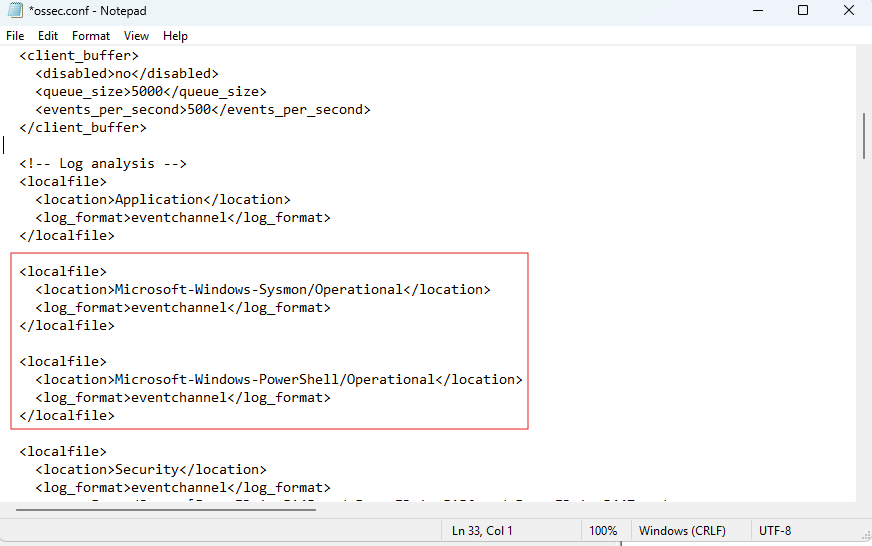 On the Wazuh manager side, we update ossec.conf to ensure all Windows event channels are collected — not just the default Security and System logs.