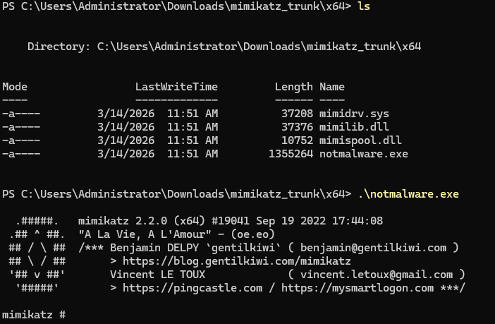 We execute Mimikatz on the DC again — this time with the binary renamed — to confirm the OriginalFileName rule triggers regardless of the file name.