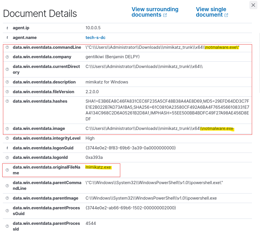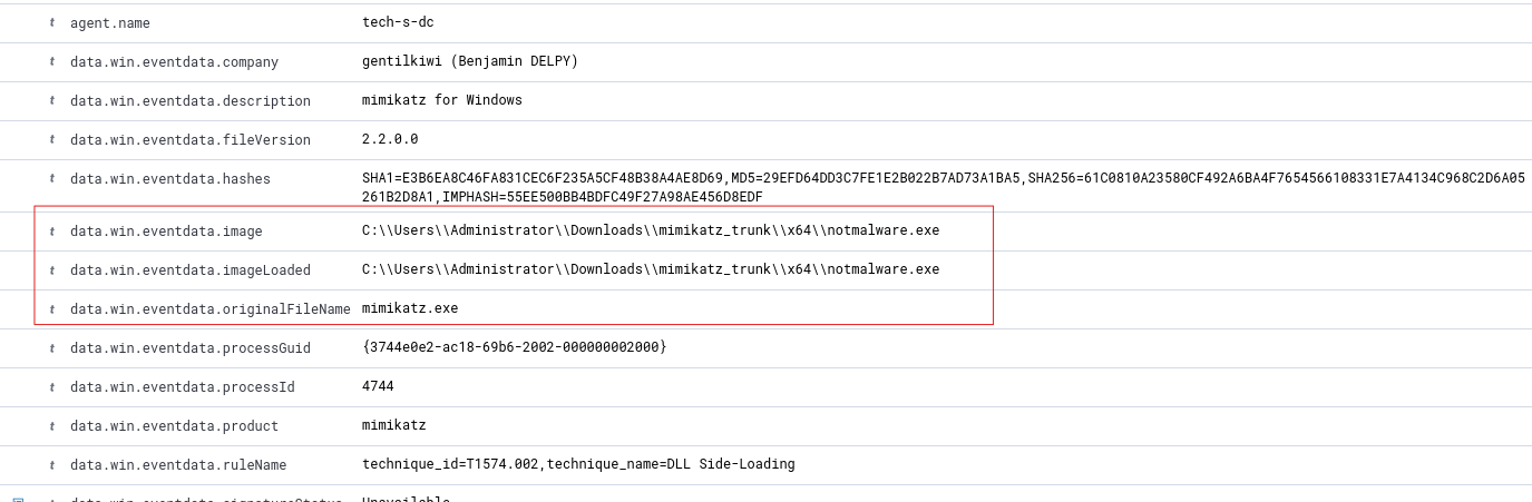 To find the correct Sysmon field, we rename the Mimikatz binary to something generic and execute it, then inspect the Sysmon event in Wazuh to identify which field still shows mimikatz.exe.