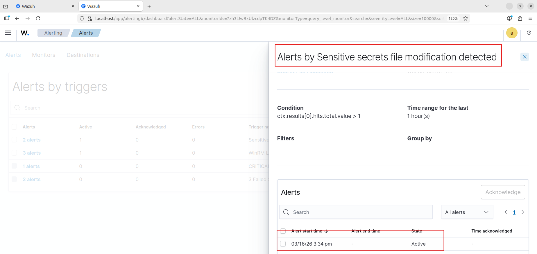✅ File Integrity Monitoring alert — access to the secrets file detected