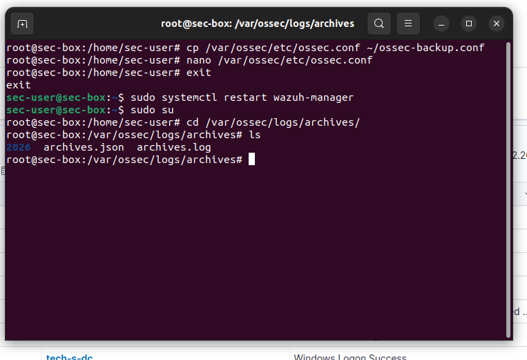 Reference: MyDFIR’s Wazuh video series (video 4) covers the ossec.conf and filebeat configuration for archive log ingestion.