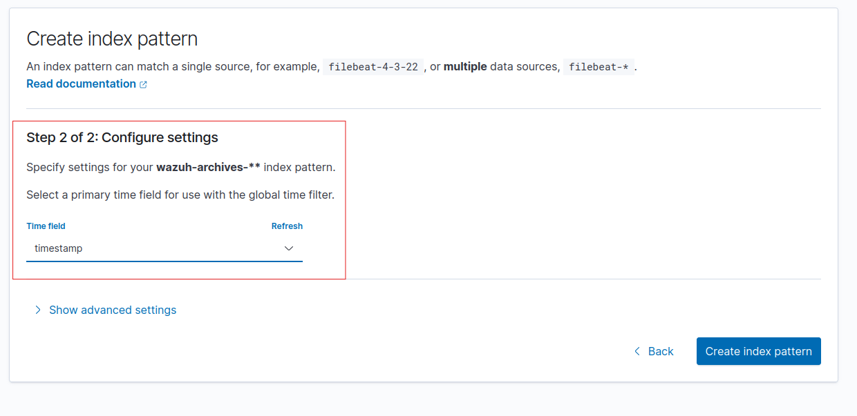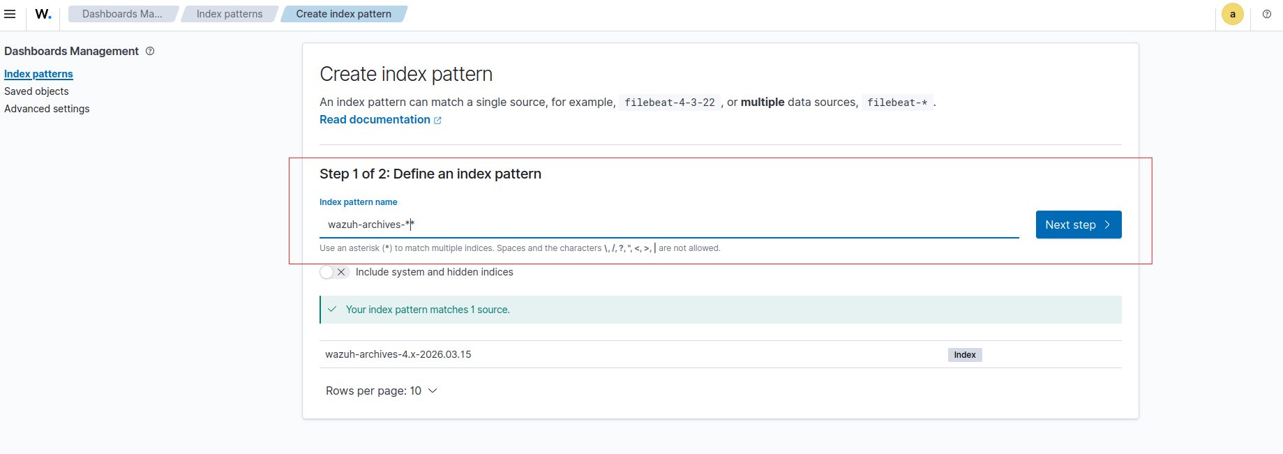 Archive log index pattern created in the Wazuh Dashboard