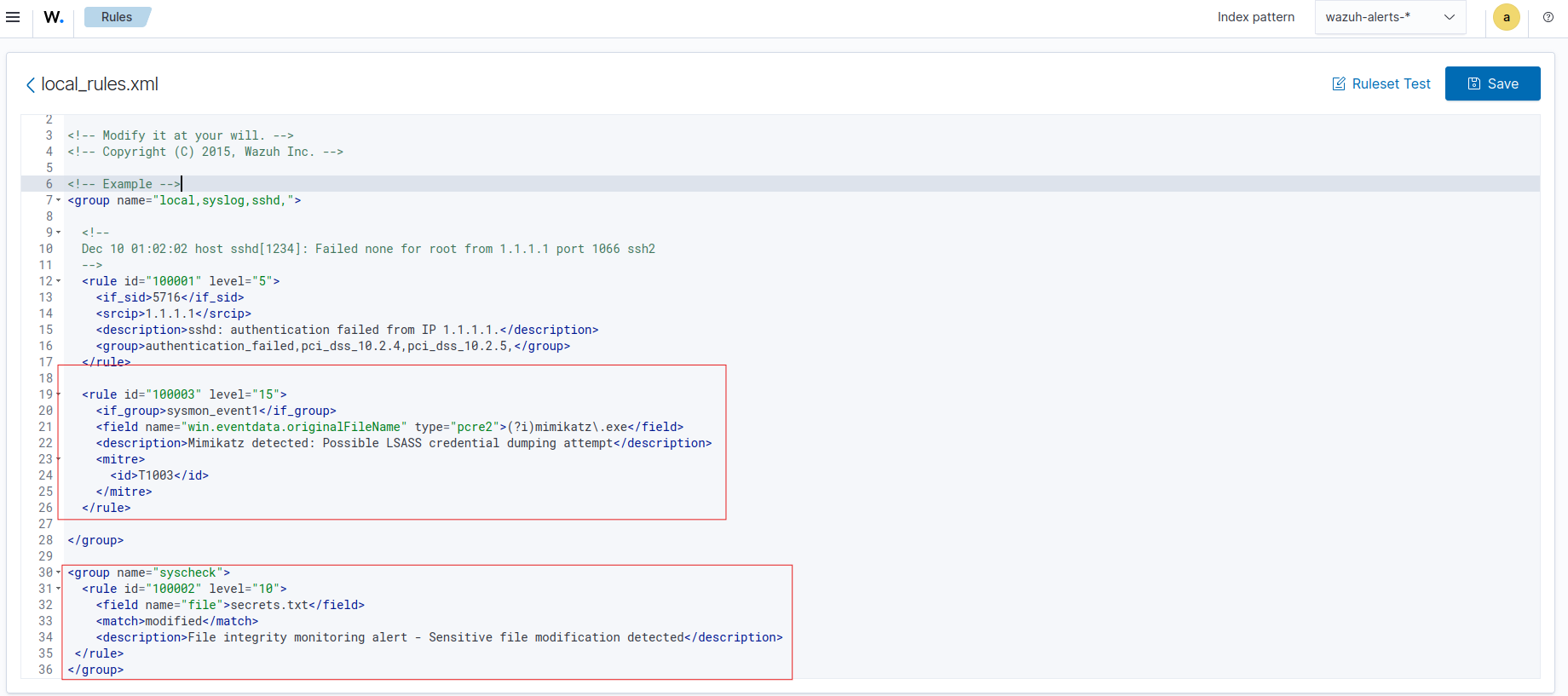 Custom Wazuh XML rules — Mimikatz (targeting OriginalFileName) + secrets file FIM