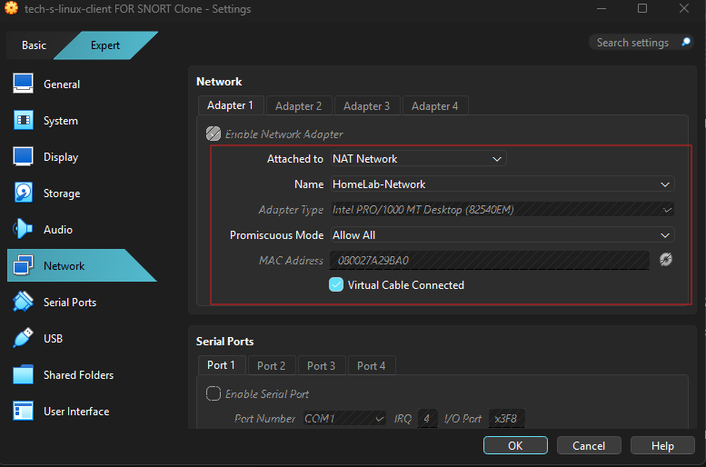 $HOME_NETwith the specific IP address or network range you wish to protect. To monitor your entire subnet, use CIDR notation (e.g., 10.0.0.0/24). Proper placement is critical: if Snort is misplaced, it will fail to detect scans across your network. In this architecture, all VMs are connected to the same VirtualBox NAT Network (HomeLab-Network). To give Snort full visibility into all VM traffic, the Ubuntu Snort VM is configured with Promiscuous Mode set to Allow All under its network adapter settings. This allows Snort to capture and inspect traffic between all virtual machines on the network — not just traffic directed at its own IP address — without requiring complex virtual switch mirroring or hypervisor-level configurations.