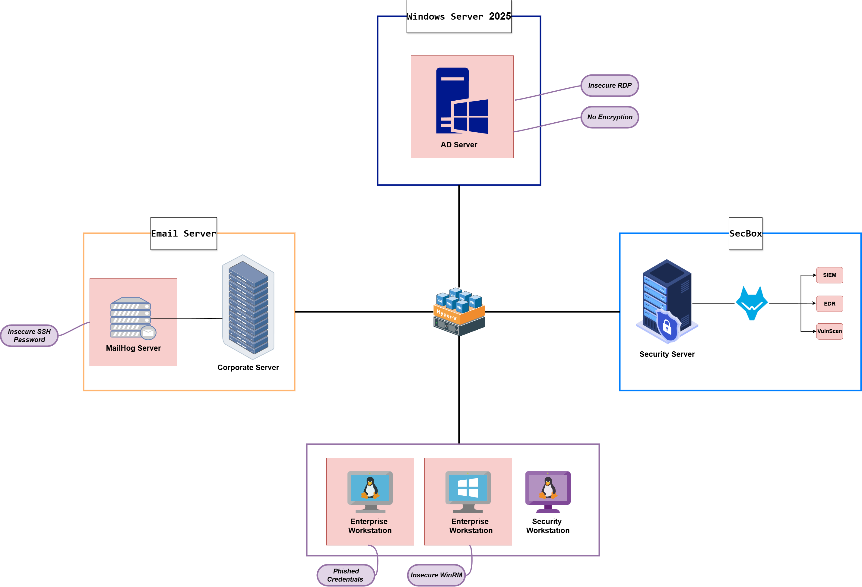 Before the attack simulation begins, the environment is intentionally weakened: SSH with root login enabled, WinRM and RDP open, and MailHog running as the internal mail server.